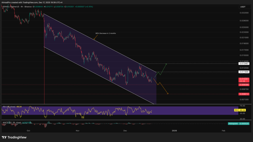 After the news, Pengu crashed 20% to under $0.0097 before bouncing, but the rebound still looks uncertain.